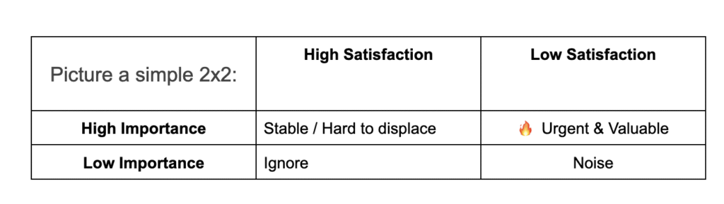 You’ve likely found a High Importance / Low Satisfaction problem. That’s not just a good call. That’s a strong outbound angle.